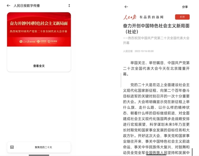 为做好中国共产党第二十次全国代表大会宣传工作,助力二十大新闻信息有效触达,人民日报数字传播携手中国联通集团、联通在线公司,以5G消息富媒体展现形式第一时间将党的声音传递给人民群众。