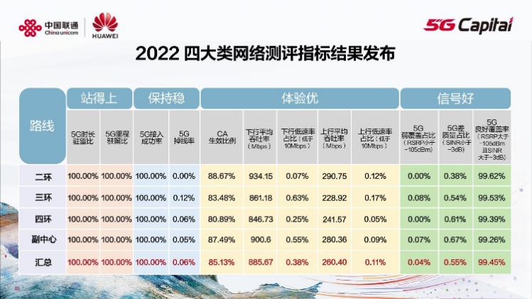 10月25日,2022全球移动宽带论坛期间,北京联通携手华为发布了全球最大规模5G 200MHz大带宽城市网络,基站规模超过3000个,实现了北京城市核心区域的全面覆盖。实际路测结果显示,5G用户下行峰值速率达到1.8Gbps,下行平均速率达到885.7Mbps,上行平均速率达到260.4Mbps,5G网络CA(载波聚合)生效比达到85%,为用户提供“加倍京彩”的无线通信服务。