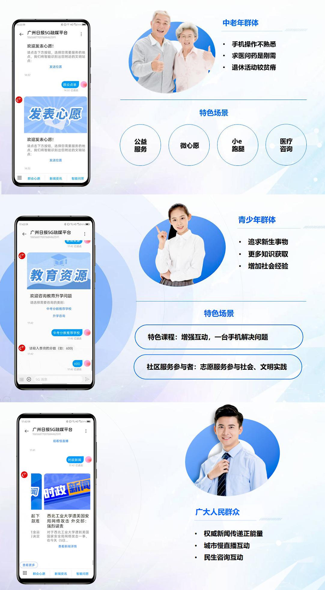 与传统短信仅支持文本相比,5G消息可发送更丰富的多媒体内容,个人用户还可通过消息携带的按钮、菜单以智能机器人的形式,实现“消息即服务”,提升消息价值。广州日报5G消息服务针对不同受众群体构建了多个特色应用场景,为用户提供权威资讯、城市漫直播、公益志愿活动资讯、市民活动资讯等内容,建立党媒与群众之间高效、可信、有趣的沟通,提升人民群众对基层治理成果的感知。