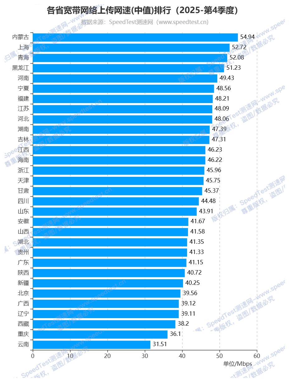 再来看看2025年第4季度全国各省(自治区、直辖市)宽带网络上传网速排行,内蒙古自治区排名第一,上传网速为54.94Mbps;排名第二的是上海市,上传网速为52.72Mbps;青海省排名第三,上传网速为52.08Mbps;排名最后的三个省(自治区、直辖市)为西藏自治区、重庆市和云南省,上传网速分别为38.2Mbps、36.1Mbps和31.51Mbps。