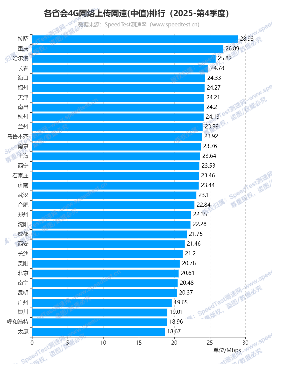 各省会城市4G网络上传排行中,排名前三的省会城市分别为拉萨市、重庆市和哈尔滨市,上传网速分别为28.93Mbps、26.89Mbps和25.82Mbps;排名最后的三个省会城市分别为银川市、呼和浩特市和太原市,上传网速分别为19.01Mbps、18.96Mbps和18.67Mbps。