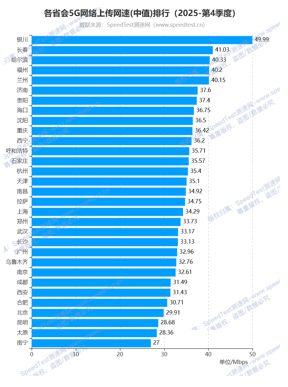 再来看看各省会城市5G网络上传网速排行,排名前三的省会城市分别为银川市、长春市和哈尔滨市,上传网速分别为49.99Mbps、41.03Mbps和40.33Mbps;排名最后三位的省会城市为昆明市、太原市和南宁市,上传网速为28.68Mbps、28.36Mbps和27Mbps。