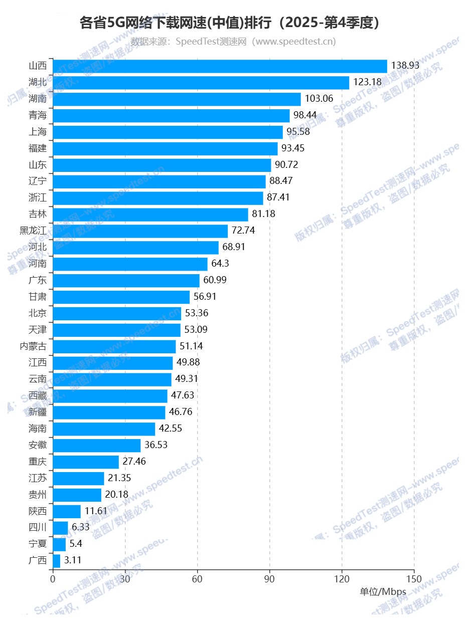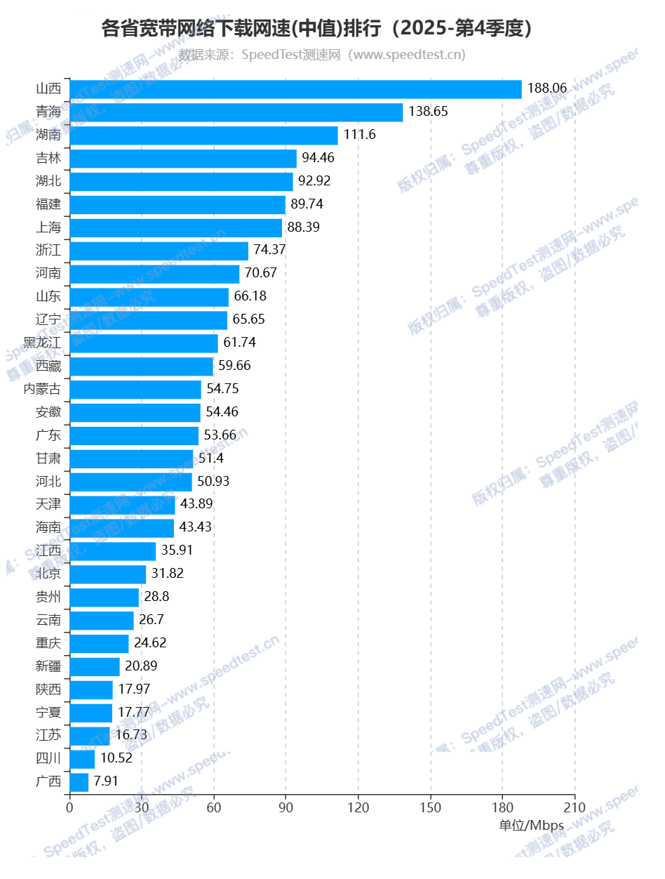 根据测速网网速大数据系统统计,2025年第4季度全国各省(自治区、直辖市)宽带网络下载网速排行中,山西省排名第一,下载网速为188.06Mbps,排名第二和第三的分别为青海省和湖南省,下载网速分别为138.65Mbps和111.6Mbps;排名最后的三个省(自治区、直辖市)为江苏省、四川省和广西壮族自治区,下载网速分别为16.73Mbps、10.52Mbps和7.91Mbps。