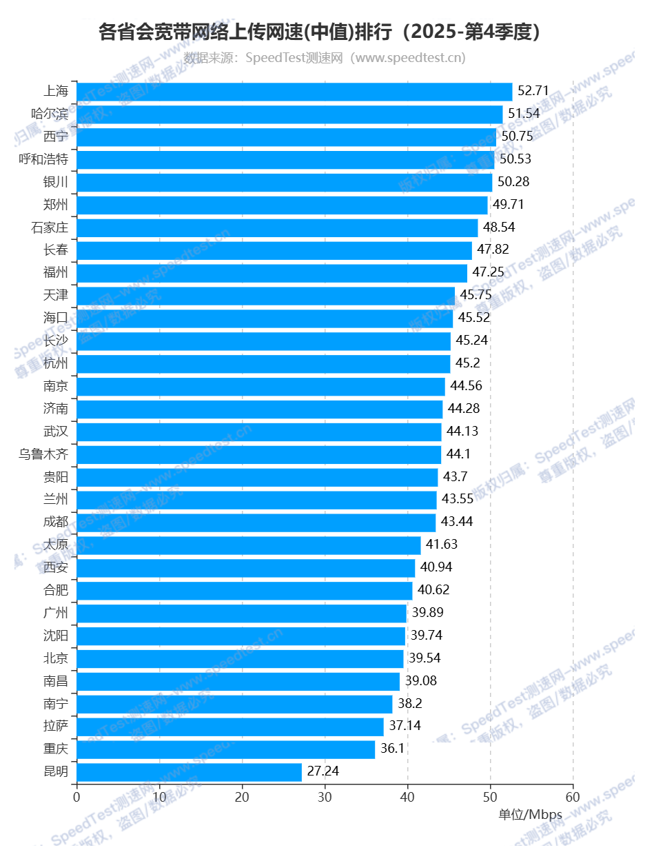 各省会城市宽带网络上传网速排行中,上海市上传网速为52.71Mbps,排名第一;排名第二的是哈尔滨市,上传网速为51.54Mbps;西宁市排名第三,上传网速为50.75Mbps;排名最后的三个省会城市为拉萨市、重庆市和昆明市,上传网速分别为37.14Mbps、36.1Mbps和27.24Mbps。