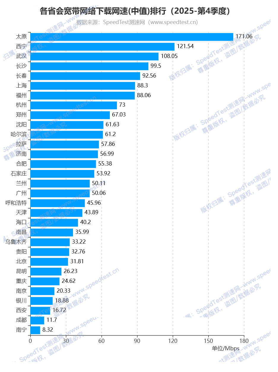 了解完了各省的排名,再来看看各省会城市的网速排名: 在宽带网络下载网速排行中,太原市排名第一,下载网速为171.06Mbps;西宁市排名第二,下载网速为121.54Mbps;武汉市排名第三,网速为108.05Mbps;排名最后的三个省会城市为西安市、成都市和南宁市,网速分别为16.72Mbps、11.7Mbps和8.32Mbps。