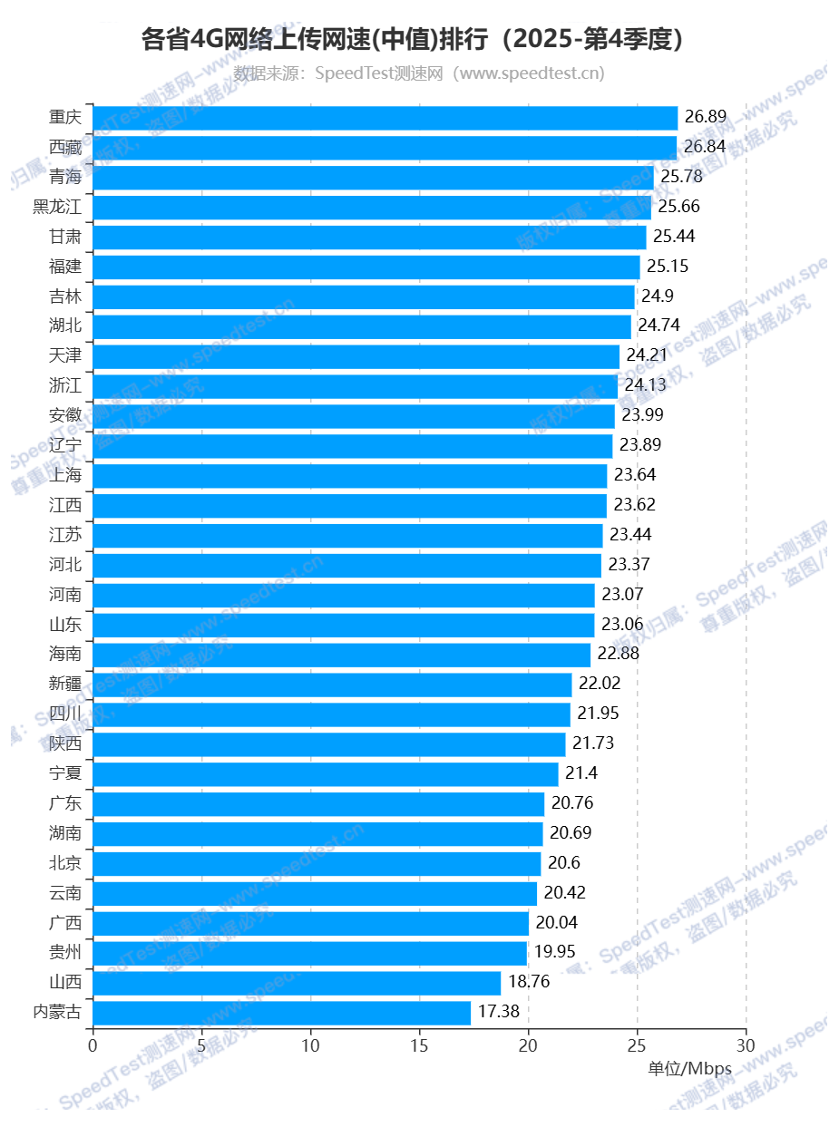 接下来看看全国各省(自治区、直辖市)4G网络上传网速排行情况,重庆市排名第一,上传网速为26.89Mbps;西藏自治区紧随其后,排名第二,网速为26.84Mbps;排名第三的是青海省,网速为25.78Mbps;排名最后的三个省(自治区、直辖市)是贵州省、山西省和内蒙古自治区,分别为19.95Mbps、18.76Mbps和17.38Mbps。