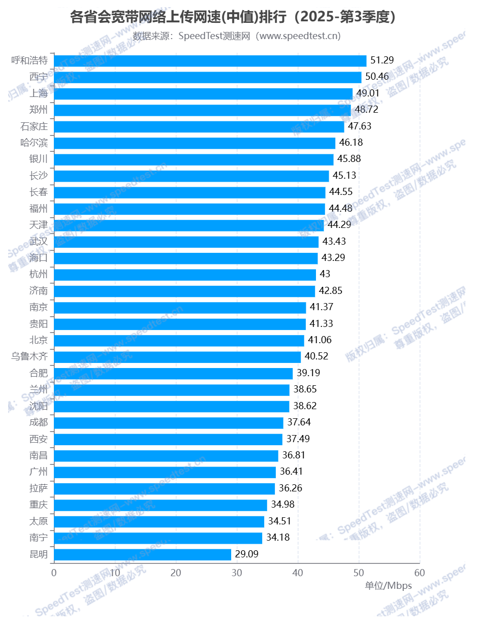 各省会城市宽带网络上传网速排行中,呼和浩特市上传网速为51.29Mbps,排名第一;排名第二的是西宁市,上传网速为50.46Mbps;上海市排名第三,上传网速为49.01Mbps;排名最后的三个省会城市为太原市、南宁市和昆明市,上传网速分别为34.51Mbps、34.18Mbps和29.09Mbps。
