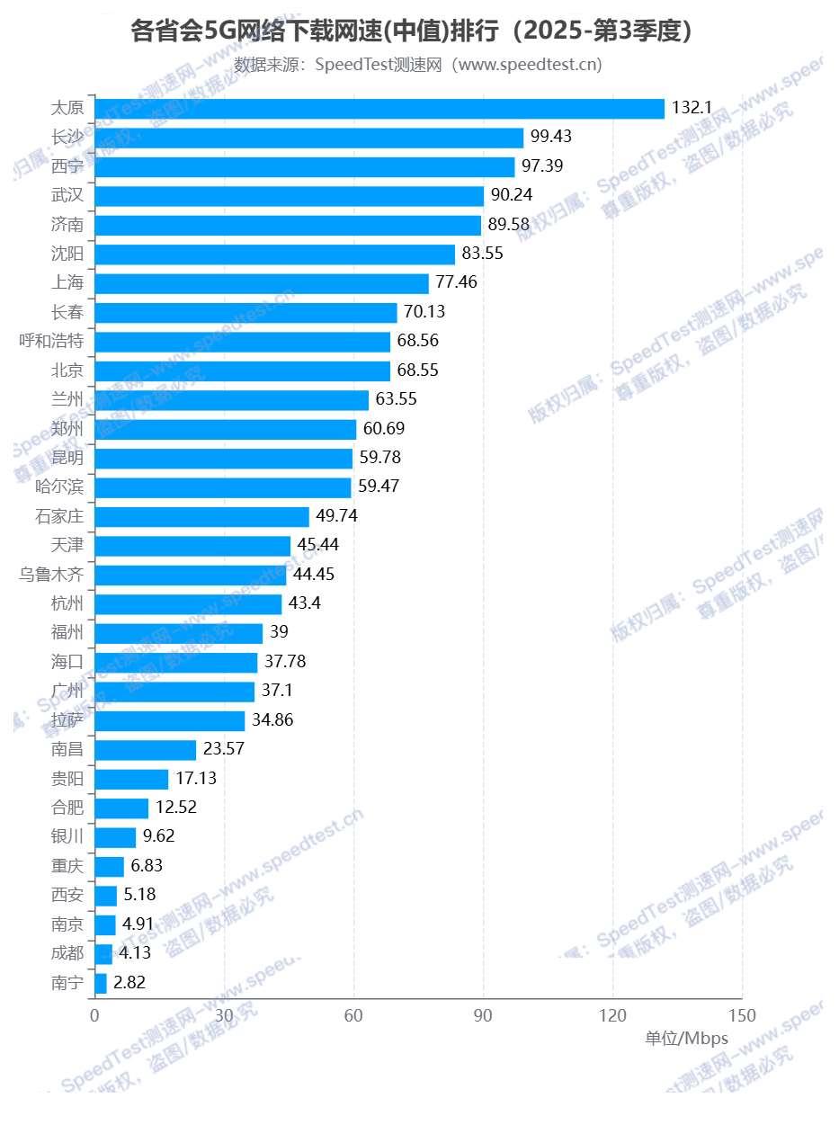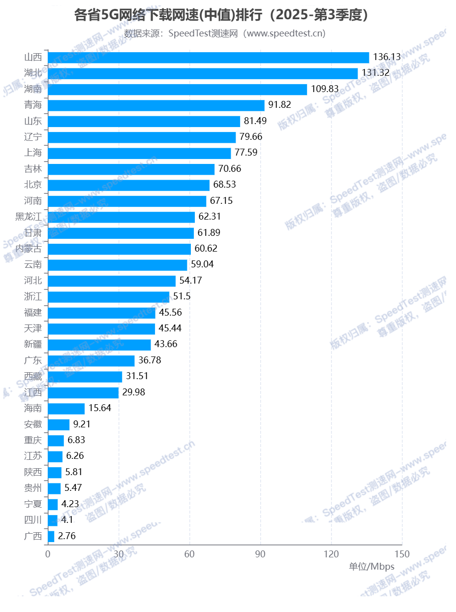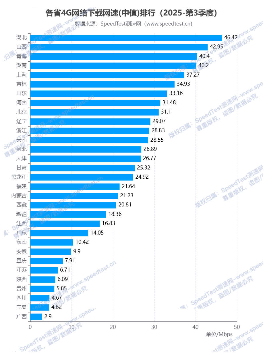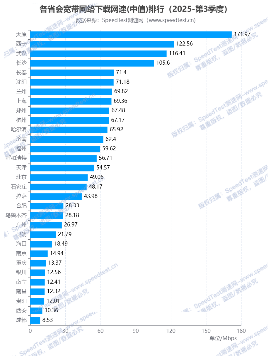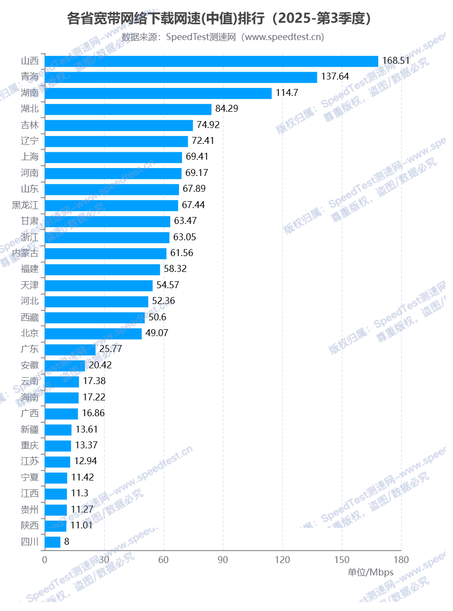 根据测速网网速大数据系统统计,2025年第3季度全国各省(自治区、直辖市)宽带网络下载网速排行中,山西省排名第一,下载网速为168.51Mbps,排名第二和第三的分别为青海省和湖南省,下载网速分别为137.64Mbps和114.7Mbps;排名最后的三个省(自治区、直辖市)为贵州省、陕西省和四川省,下载网速分别为11.27Mbps、11.01Mbps和8Mbps。