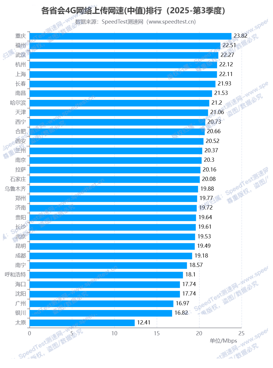 各省会城市4G网络上传排行中,排名前三的省会城市分别为重庆市、福州市和武汉市,上传网速分别为23.82Mbps、22.51Mbps和22.27Mbps;排名最后的三个省会城市分别为广州市、银川市和太原市,上传网速分别为16.97Mbps、16.82Mbps和12.41Mbps。