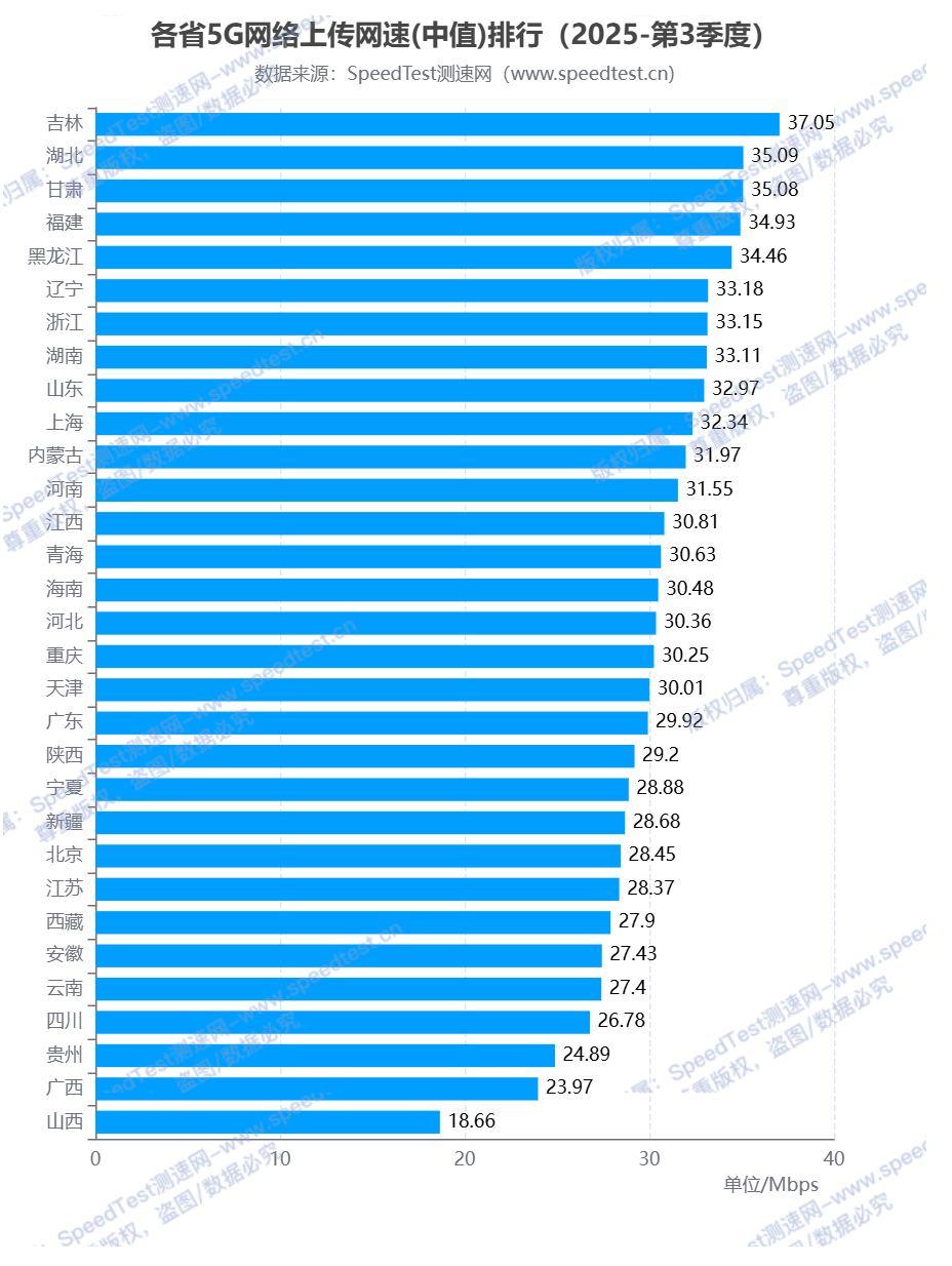 接下来看看全国各省(自治区、直辖市)5G网络上传网速排行,排名前三的省份分别是吉林省、湖北省和甘肃省,上传网速分别为37.05Mbps、35.09Mbps、35.08Mbps;排名最后的三个省(自治区、直辖市)是贵州省、广西壮族自治区和山西省,上传网速分别为24.89Mbps、23.97Mbps和18.66Mbps。