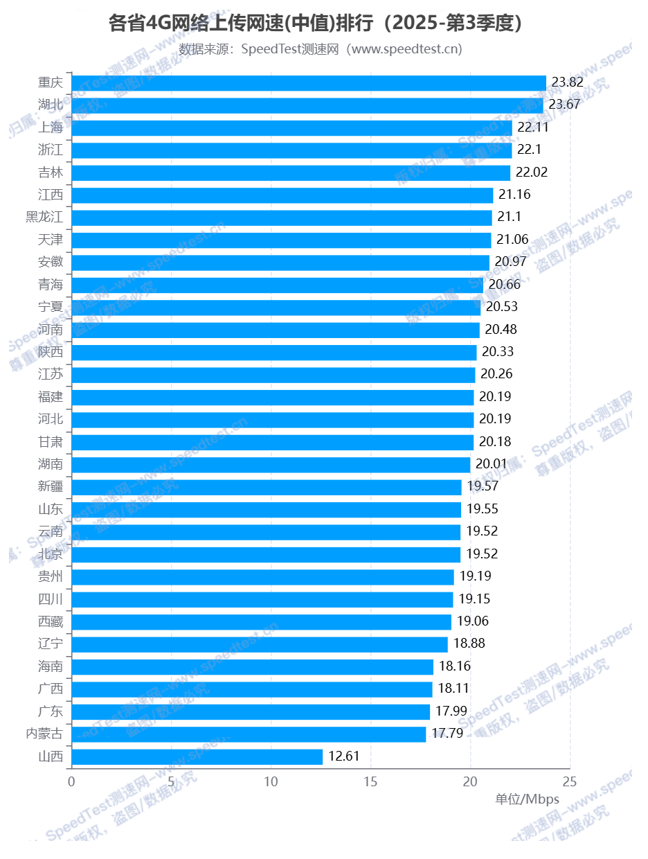 接下来看看全国各省(自治区、直辖市)4G网络上传网速排行情况,重庆市排名第一,上传网速为23.82Mbps;湖北省紧随其后,排名第二,网速为23.67Mbps;排名第三的是上海市,网速为22.11Mbps;排名最后的三个省(自治区、直辖市)是广东省、内蒙古自治区和山西省,分别为17.99Mbps、17.79Mbps和12.61Mbps。