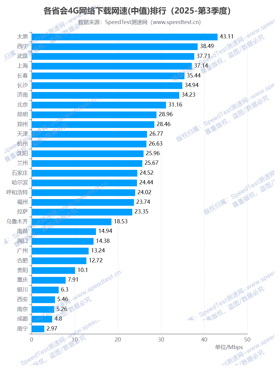 再来看看各省会城市的排名情况: 在4G网络下载网速排行中,太原市排名第一,下载网速为43.11Mbps,排名第二的是西宁市,下载网速为38.49Mbps;武汉市排名第三,下载网速为37.71Mbps;排名最后的三个省会城市为南京市、成都市和南宁市,下载网速分别为5.26Mbps、4.8Mbps和2.97Mbps。