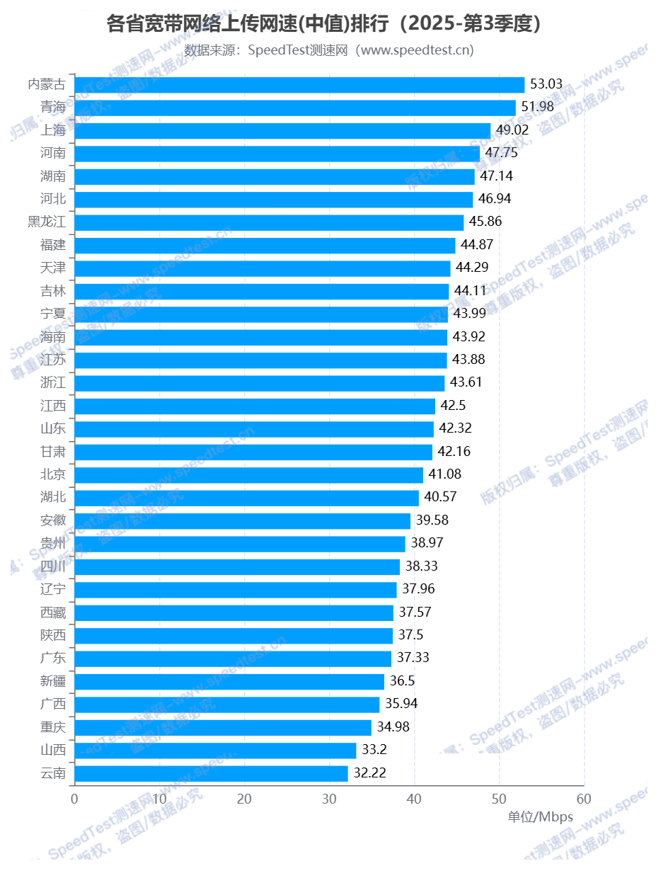 再来看看2025年第3季度全国各省(自治区、直辖市)宽带网络上传网速排行,内蒙古自治区排名第一,上传网速为53.03Mbps;排名第二的是青海省,上传网速为51.98Mbps;上海市排名第三,上传网速为49.02Mbps;排名最后的三个省(自治区、直辖市)为重庆市、山西省和云南省,上传网速分别为34.98Mbps、33.2Mbps和32.22Mbps。