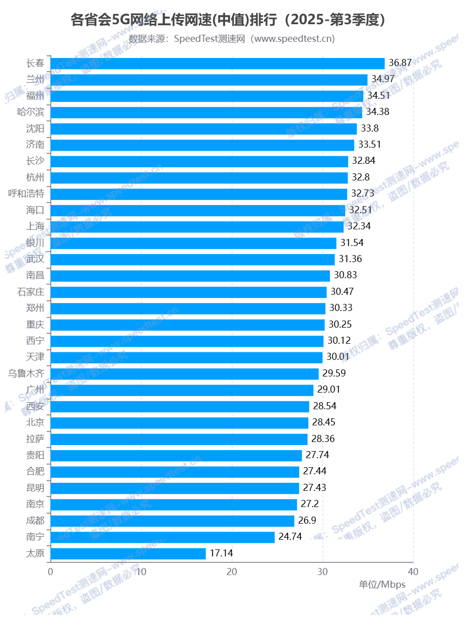 再来看看各省会城市5G网络上传网速排行,排名前三的省会城市分别为长春市、兰州市和福州市,上传网速分别为36.87Mbps、34.97Mbps和34.51Mbps;排名最后三位的省会城市为成都市、南宁市和太原市,上传网速为26.9Mbps、24.74Mbps和17.14Mbps。