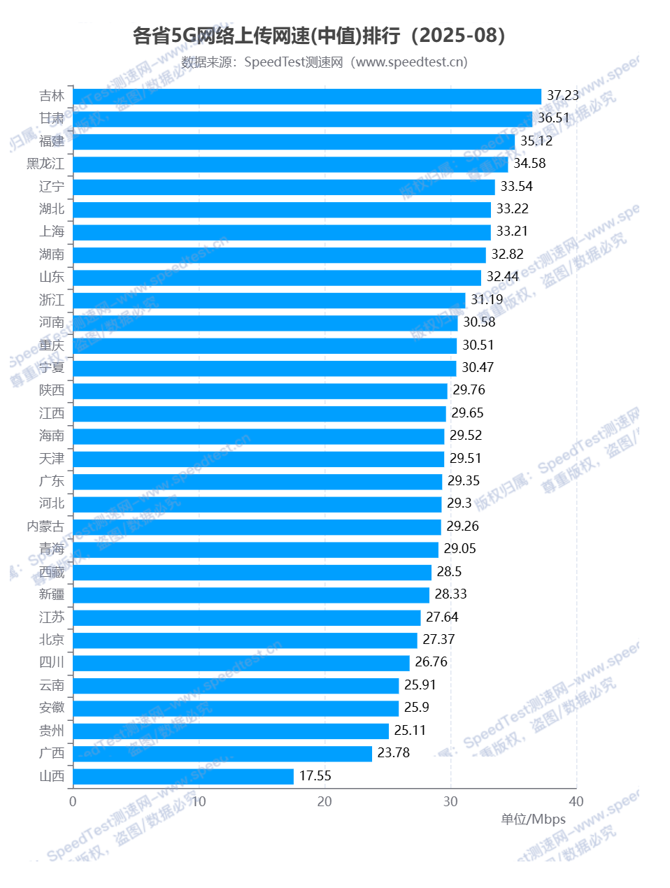 5G网络上传网速排行中,吉林省排名第一,上传网速为37.23Mbps,甘肃省排名第二,上传网速为36.51Mbps,排名第三的为福建省,上传网速为35.12Mbps;排名最后的三个省(自治区、直辖市)分别为贵州省、广西壮族自治区和山西省,分别为25.11Mbps、23.78Mbps和17.55Mbps。