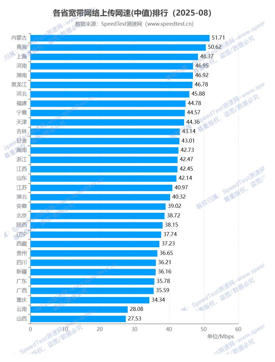 在宽带网络上传网速排行榜中,内蒙古自治区排名第一,上传网速为51.71Mbps;排名第二和第三的分别为青海省和上海市,上传网速分别为50.62Mbps、48.37Mbps;排名最后的三个省(自治区、直辖市)分别为重庆市、云南省和山西省,上传网速分别为34.34Mbps、28.08Mbps和27.53Mbps。