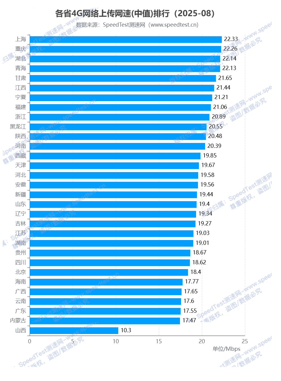 在4G网络上传网速排行中,排名前三的为上海市、重庆市和湖北省,上传网速分别为22.33Mbps、22.26Mbps和22.14Mbps;排名最后的为山西省,上传网速是10.3Mbps。