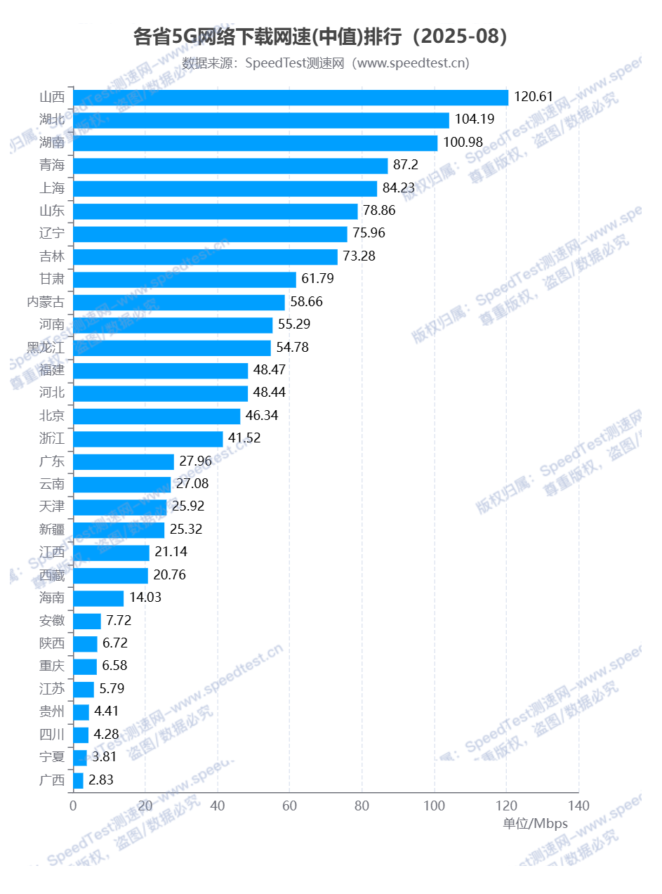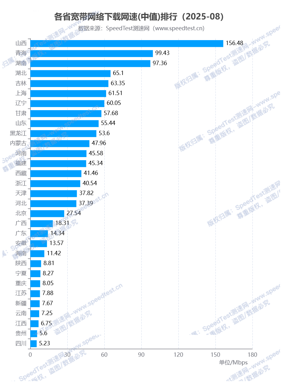 根据测速网网速大数据系统统计,2025年8月全国各省(自治区、直辖市)宽带网络下载网速排行中,山西省排名第一,下载网速为156.48Mbps;排名第二和第三的分别为青海省和湖南省,下载网速分别为99.43Mbps、97.36Mbps。排名最后的为四川省,下载网速为5.23Mbps。