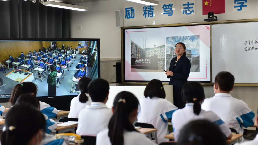 在这间特别的教室里,授课老师没有站在讲台上,而是在2700多公里外的西安高新一中远程讲课。这间教室如同一扇“时空传送门”,为旦增伟和其他同学打破了时空距离,实现了和千里之外的老师同学“云”相聚。